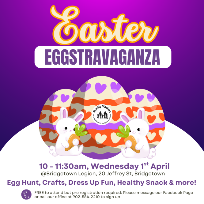 Easter is early this year so we are kicking off April with our Easter Eggstravaganza! Join us Wednesday April 1st from 10 – 11:30am at the Bridgetown Legion for a fun morning of crafts, dress up, egg hunt and more