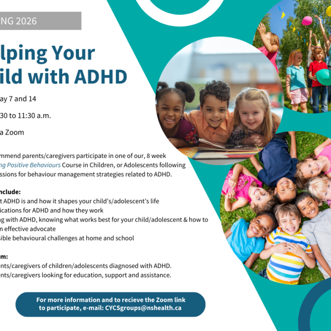 For more information about these upcoming courses or to sign up please: e-mail CYCSgroups@nshealth.ca. Helping your child with ADHD Course is being offered via zoom, Promoting Positive Behaviours @Boardroom at Chipman Building, Kentville & Helping Anxious Children @Annapolis East Elementary
