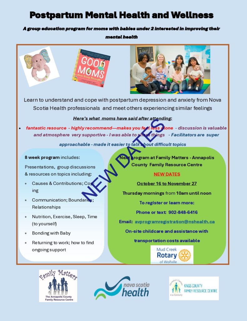 Lawrencetown/Annapolis County: Oct. 16 – Thursday mornings from 10-noon at Family Matters – Annapolis County Family Resource Centre